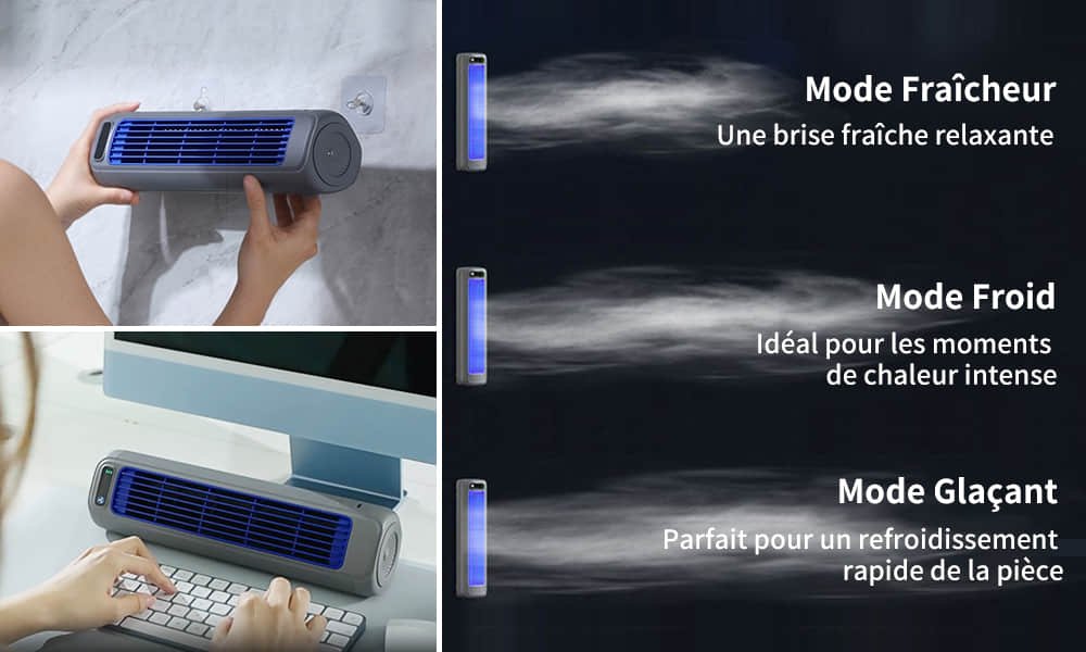 Ce refroidisseur compact et portable est facile à installer partout : sur votre bureau, votre table de nuit, ou même monté sur le mur. Il est parfait pour n’importe quel espace, que ce soit chez vous, au bureau, ou même en déplacement. Profitez d’air frais où que vous soyez !
